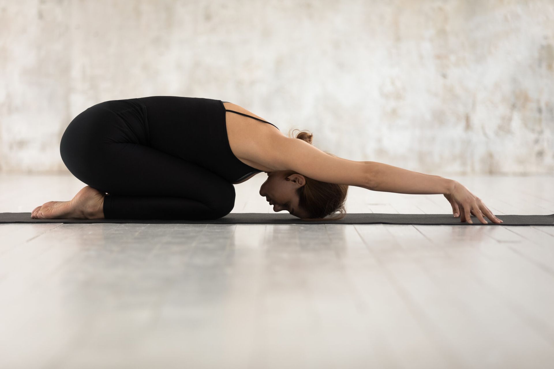 To do the child pose, kneel on a mat. Then, sit backward so you are sitting on your heels. Once you do that, place your arms on either side of your legs. Then, rest your head on the floor in front of you, bending your body forward. You’ll feel the stretch right away.